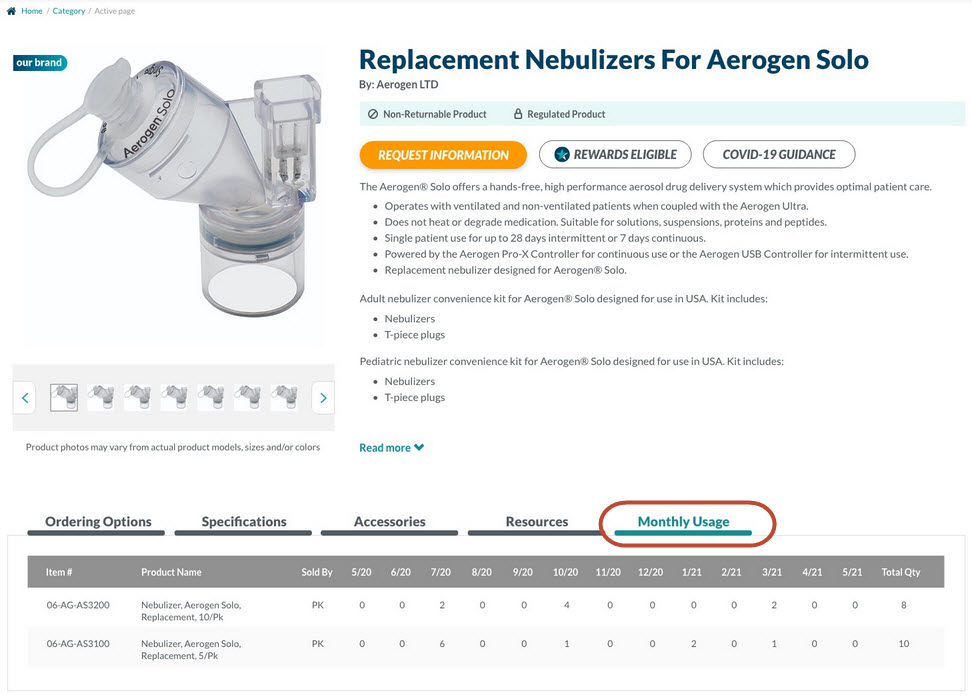 A Monthly Usage tab will appear on the product detail pages when you are signed in on your account. Clicking on this tab will display the purchase activity for the product. The site will show you the past 12 months of purchases broken down per month.