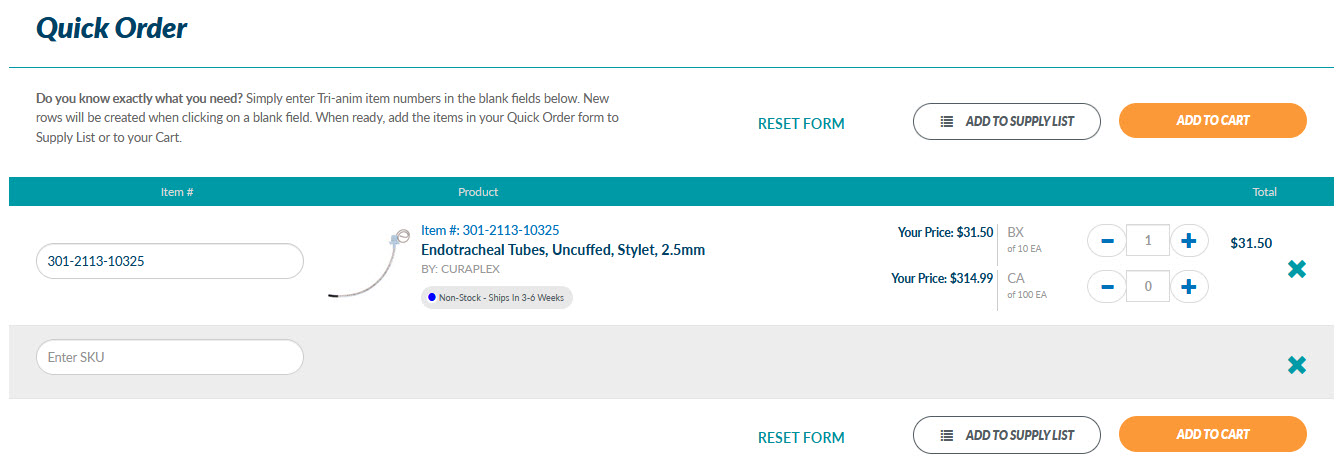 Quick Order enables you to order items quickly by simply entering a Tri-anim item number and quantity into a form. Click on the "Quick Order" link in the header at the top of the Tri-anim site to open the form.