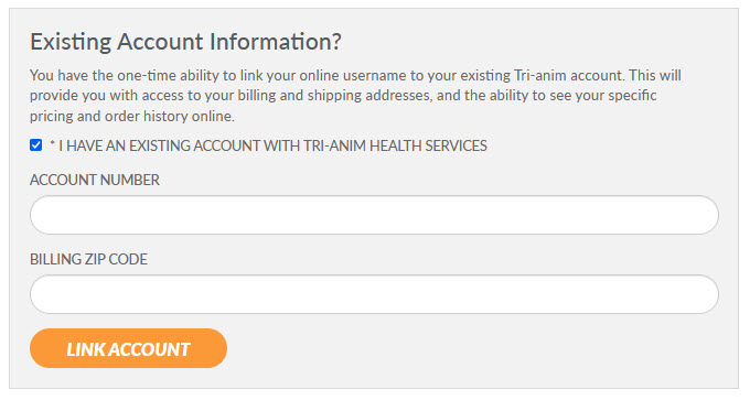 If your organization has an existing Tri-anim account and you want to create a new username for it, select the box "I have an existing account with Tri-anim Health Services" on the Create an Account page and provide your account number plus billing zip code for account verification.