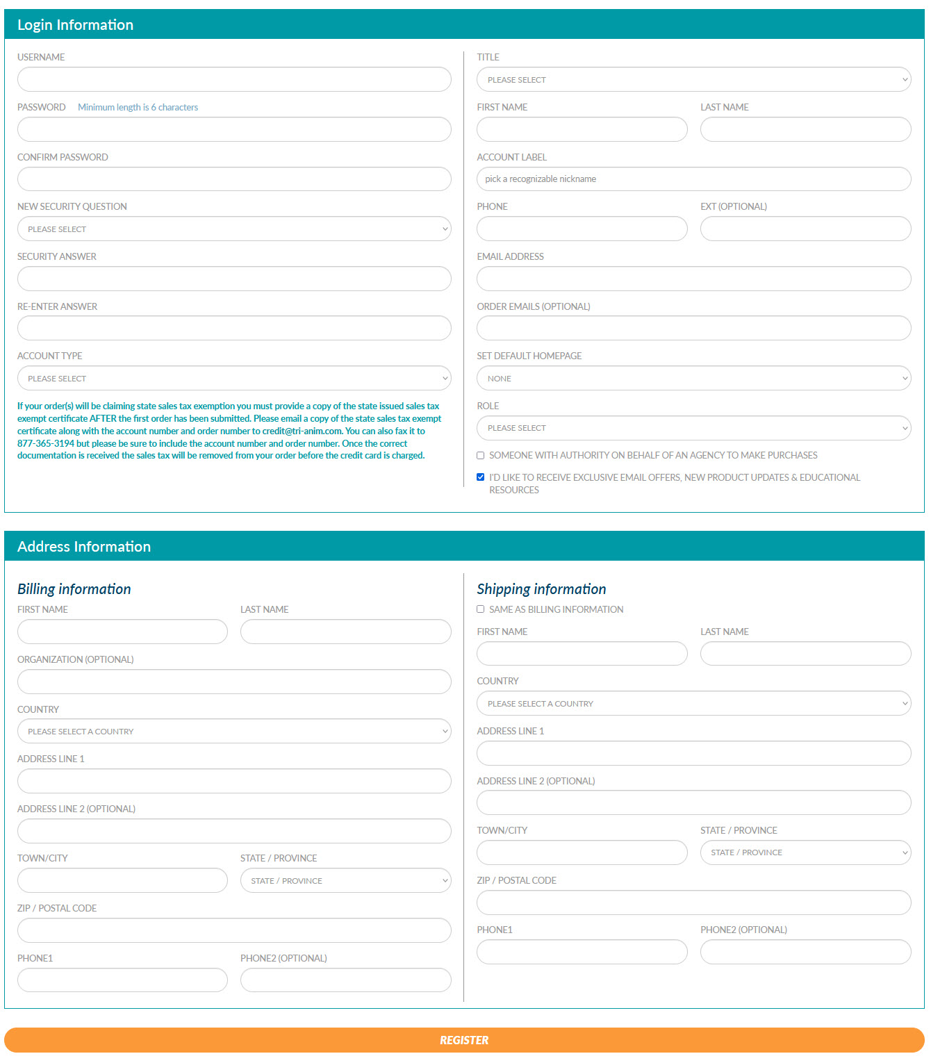 Complete the required fields within the Login Information and Address Information sections of the form. Once all required fields in the form have been completed, please click on the "Register" button at the bottom of the page.