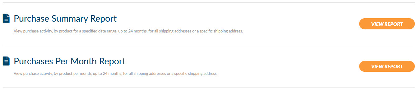 The Reports page provides additional resources for looking at the purchase activity for your account. The Purchase Per Month report lets you view purchase activity, by product for a specified date range, up to 24 months, for all shipping addresses or a specific shipping address. The Purchase Summary report lets you view purchase activity, by product per month, up to 24 months, for all shipping addresses or a specific shipping address.