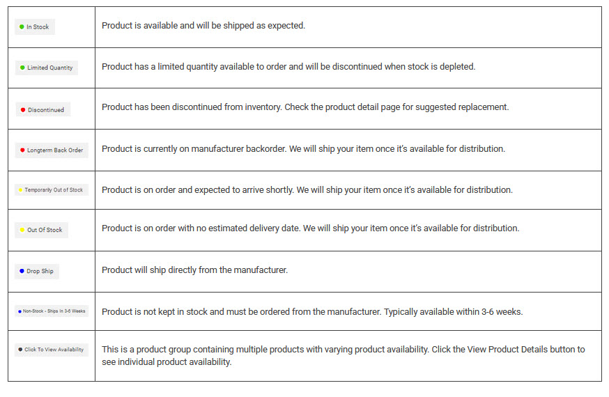 Product availability indicators are located on every product listing underneath the product name allowing you to easily determine if the product you need is in stock.